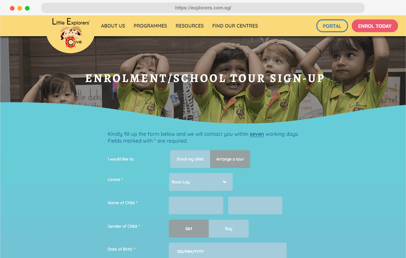 Little Explorers Cove needed to boost their online presence and strengthen their brand positioning with the element of learning through exploration. With conversion as a key aim, it was important to design the forms and lead collection methods with purpose. In addition, we also provided photography services to accurately capture the best moments of the children. These images were treated for web usage and brings life to the website.